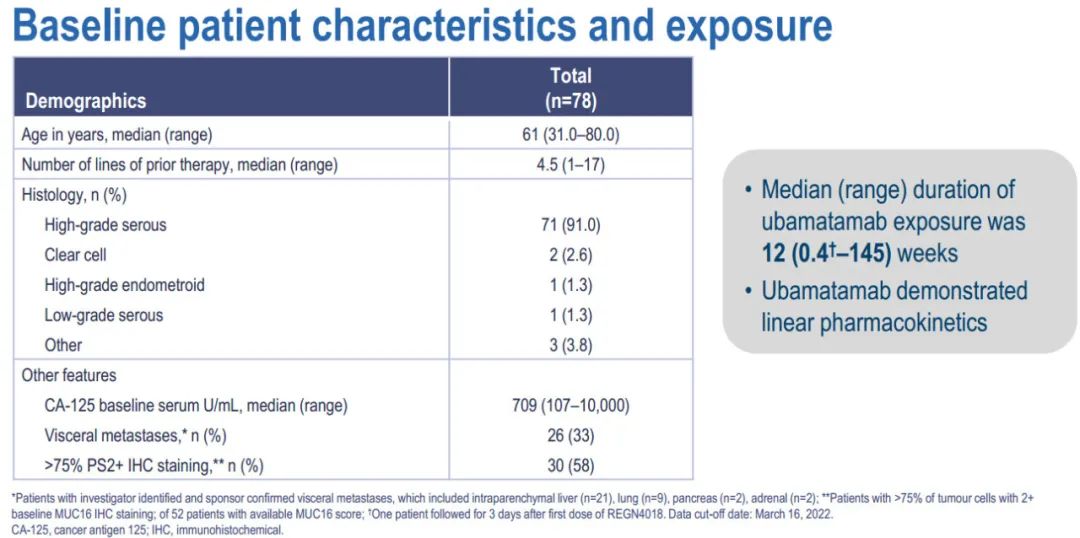 入组患者(n=78)的中位年龄为61岁(范围31-80),既往治疗线数的中位数为4.5(范围1-17)。肿瘤组织学类型包括高级别浆液癌(91%)、透明细胞癌(2.6%)、高级别子宫内膜样癌(1.3%)、低级别浆液癌(1.3%)和其他(3.8%)。基线时血清CA-125中位数为709 U/mL(范围为107-10,000)。33%的患者有内脏转移,58%的患者免疫组化(IHC)显示≥75%细胞具有PS2+染色强度。