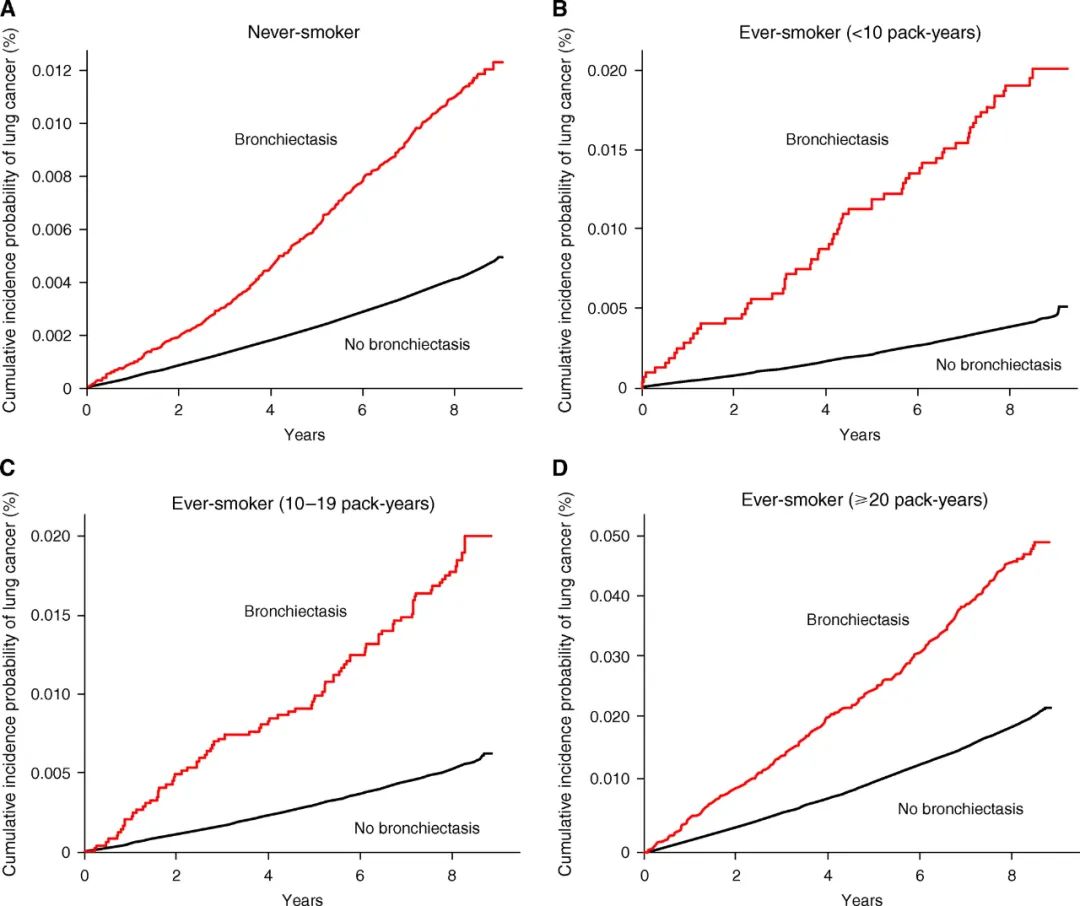 Choi H,et al.Non-Cystic Fibrosis Bronchiectasis Increases the Risk of Lung Cancer Independent of Smoking Status.Ann Am Thorac Soc.2022;19(9):1551-1560.doi:10.1513/AnnalsATS.202111-1257OC