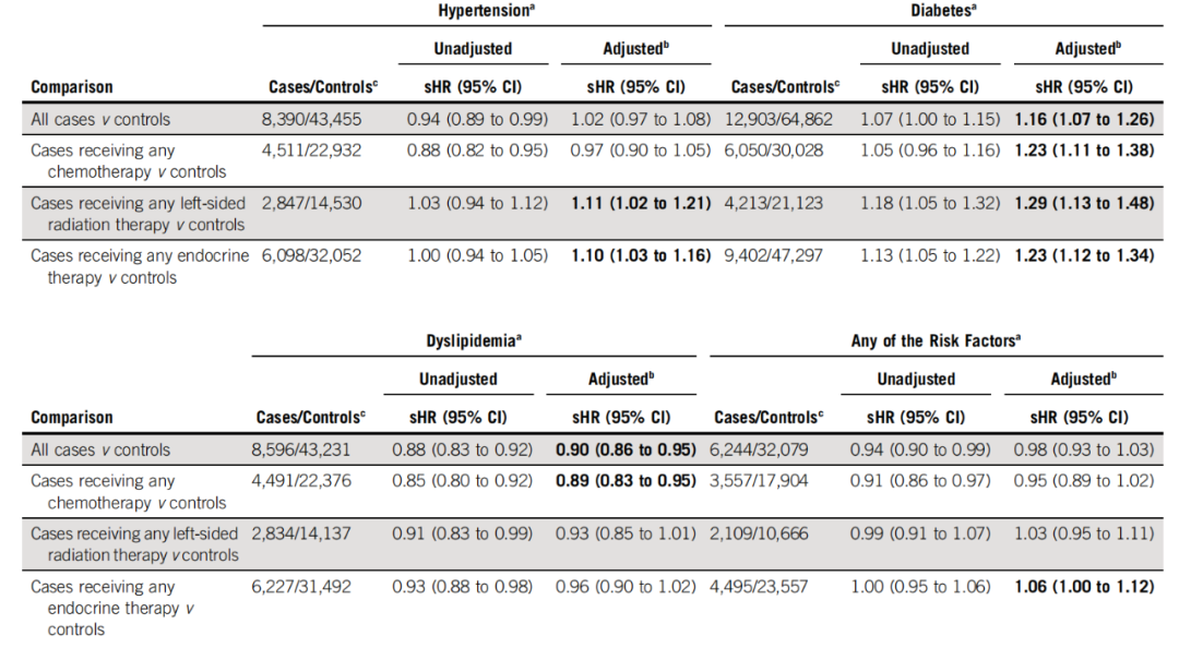 在多变量模型中,乳腺癌病例有较高的糖尿病风险(sHR,1.16;95%CI:1.07~1.26)。化疗(sHR,1.23;95%CI:1.11~1.38)、左侧放疗(sHR,1.29;95%CI:1.13~1.48)或内分泌治疗(sHR,1.23;95%CI:1.12~1.34)患者的糖尿病风险持续升高。接受左侧放疗(sHR,1.11;95%CI:1.02~1.21)或内分泌治疗(sHR,1.10;95%CI:1.03~1.16)的患者出现高血压的风险较高(表1)。