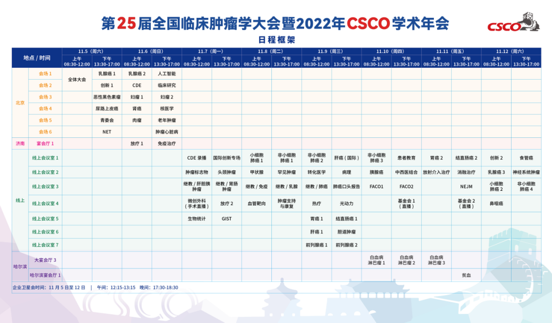 本届CSCO年会开幕式将在北京会场举行,此外,北京会场还设置了创新药物临床研究专场、CDE专场、人工智能专场、乳腺癌专场、恶性黑色素瘤专场、尿路上皮癌专场等;线上会议设置了头颈肿瘤、罕见肿瘤、胃癌、肝癌、结直肠癌、前列腺癌、小细胞肺癌、非小细胞肺癌、转化医学等专场,第十届亚洲临床肿瘤学联盟(FACO)会议也将在此期间举办;哈尔滨会场针对血液系统肿瘤设置了多个专场,济南会场也安排了放疗和免疫治疗相关专场。