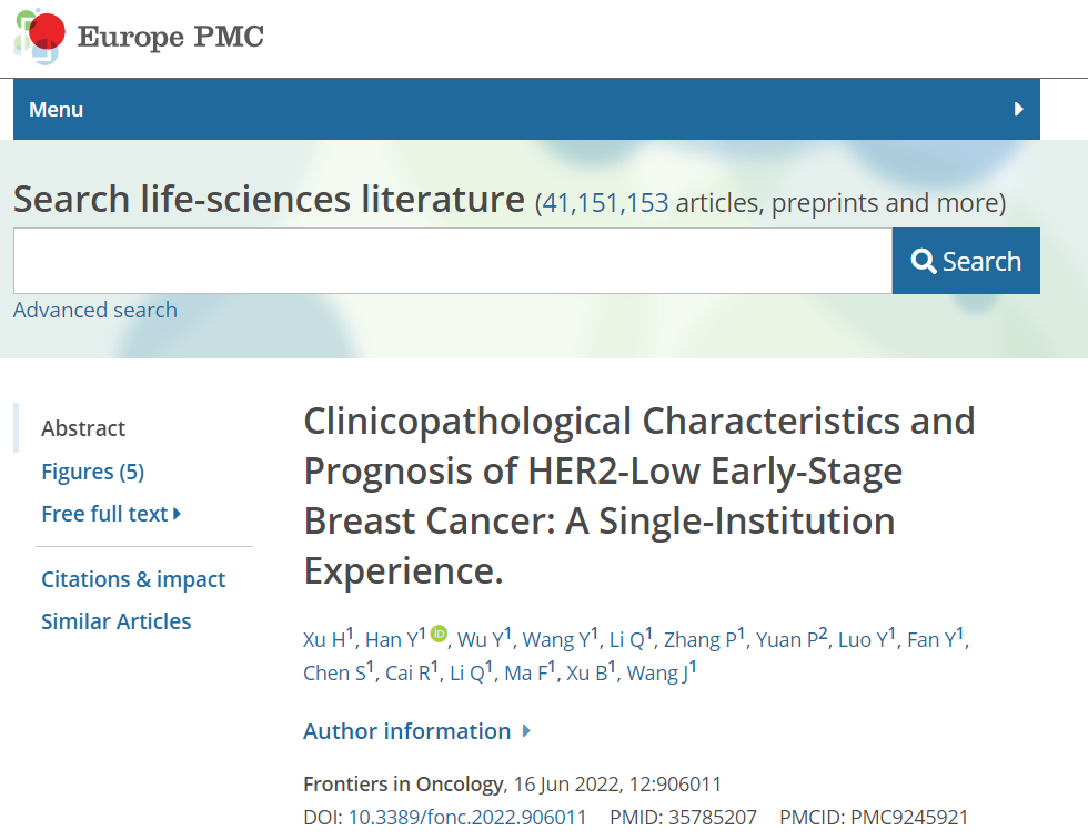 2 Li Y,Abudureheiyimu N,Mo H,Guan X,Lin S,Wang Z,et al.In Real Life,Low-Level HER2 Expression May Be Associated With Better Outcome in HER2-Negative Breast Cancer:A Study of the National Cancer Center,China.Front Oncol(2021)11:774577.doi:10.3389/fonc.2021.774577