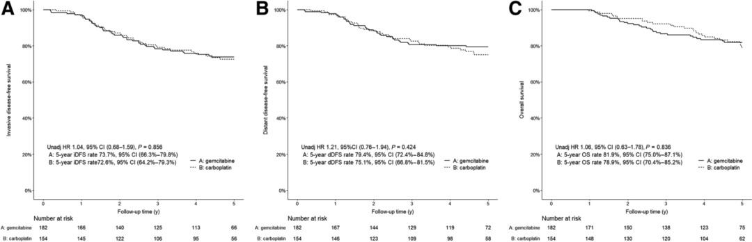 △研究中的无侵袭性疾病生存(A)、无远处疾病生存(B)和总生存率(C)