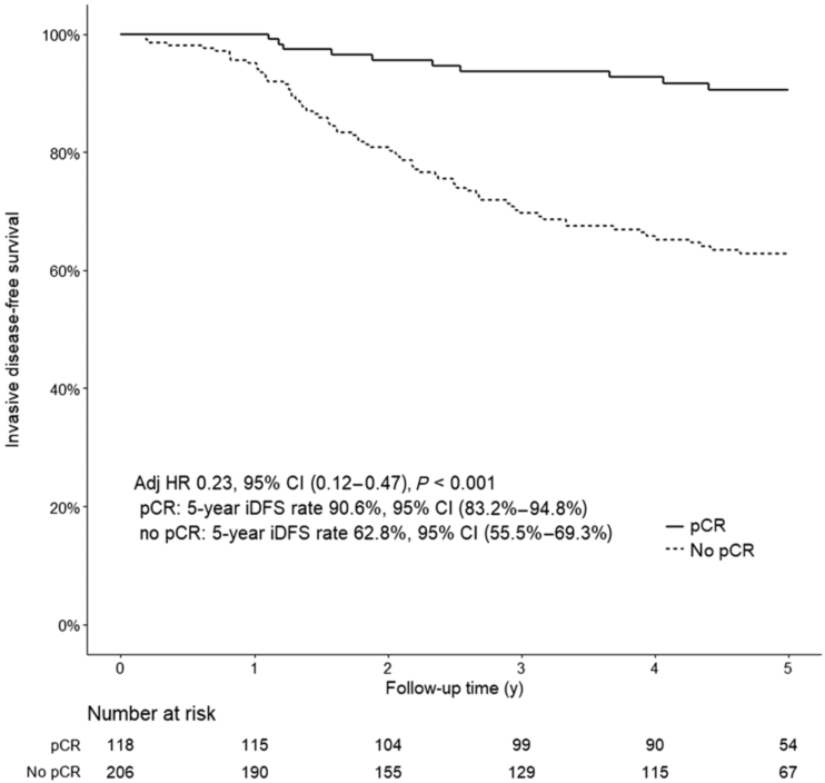 研究结果发现:化疗12周能否达到pCR与5年iDFS显著相关,达到pCR与未达到pCR患者的5年iDFS分别为90.6%和62.8%(HR,0.24;P=0.001)。白蛋白紫杉醇联合卡铂组相对于联合吉西他滨组pCR率较高,但未观察到使用卡铂的生存优势(HR,1.04;95%CI,0.68–1.59)。在达到pCR患者中,额外使用蒽环类药物化疗也与iDFS的显著优势无关(HR,1.29;95%CI,0.41-4.02)。进一步发现除了pCR率之外,淋巴结状态和高sTIL与更好的iDFS和OS均独立相关。