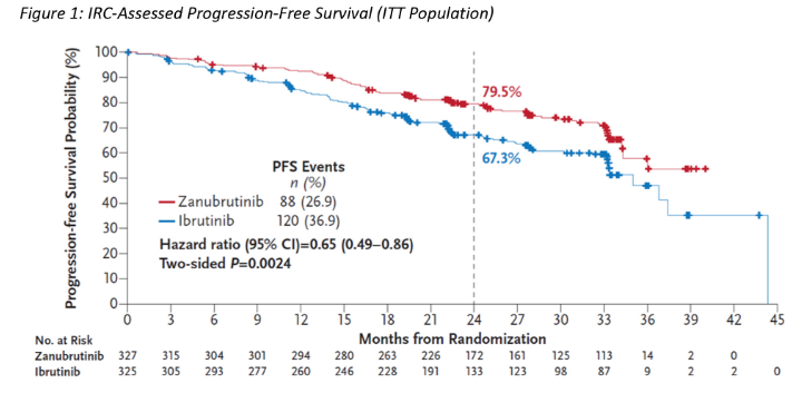 ALPINE研究III期:在复发/难治性慢淋和小淋巴细胞白血病(R/R CLL/SLL)中,泽布替尼较之于伊布替尼具有更优的PFS