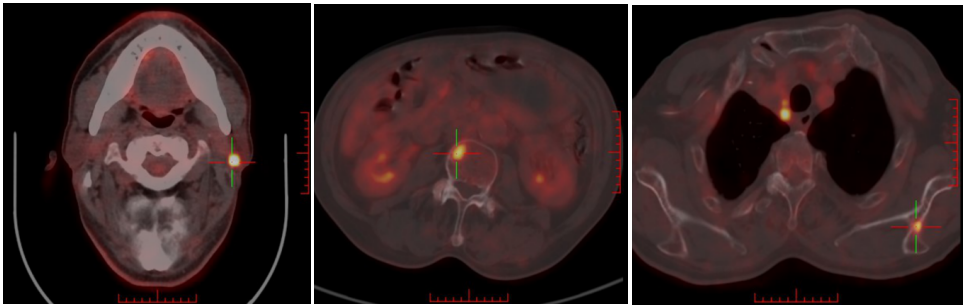2022-06-28日复查PET-CT:1、双侧头臂血管周围、右侧气管食管沟、纵隔(2R、2L、3a、4R、4L、5、6、7区)右侧肋膈角见多发FDG代谢增高淋巴结,部分淋巴结坏死,结合病史,考虑多发淋巴结转移,病变数目较前增多、体积增大。L3椎体右侧、左侧肩胛冈FDG代谢增高,考虑骨转移。2、右肺上叶前段胸膜下环形FDG代谢增高病变中心伴有坏死,病变较前稍增大;左肺上叶舌段及下叶内前基底段、右上叶及下叶多发结节,部分伴FDG代谢增高,较前未见明显变化;右侧胸膜增厚伴右侧胸膜增厚伴FDG代谢增高,较前增厚,右侧胸腔积液较前减少。余未见转移征象。综上:多发淋巴结转移,新发骨转移,考虑PD。