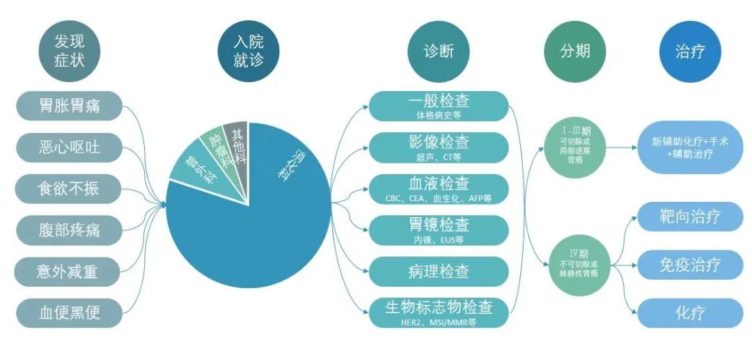 患者通常在消化科、普外科或肿瘤科就诊,接受各项检查以便医生更好地进行诊断。这些检查包括一般检查、血液检查、影像学检查、活检,其中活检是诊断的金标准。如果患者被确诊为胃癌的话,国内外指南均建议胃癌患者进行HER2、MMR等标志物检查,以确定未来是否可以从靶向治疗或免疫治疗药物中获益7。