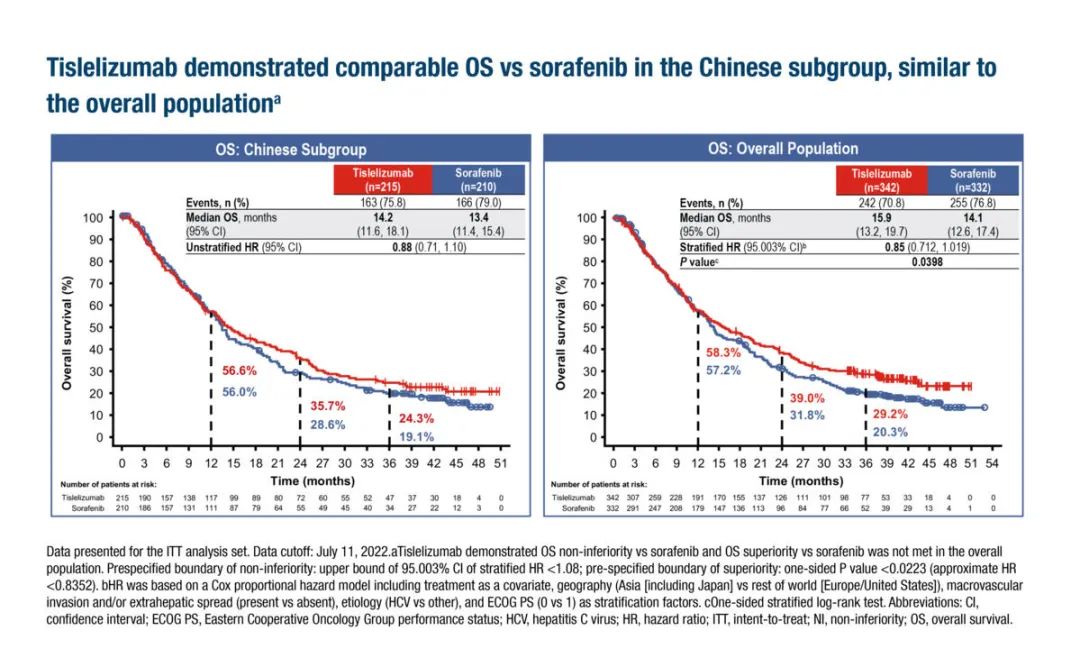 在总体人群中,替雷利珠单抗组的OS时间长15.9个月(95%CI:13.2~19.7),索拉非组的OS为14.1个月(95%CI:12.6~17.4)。