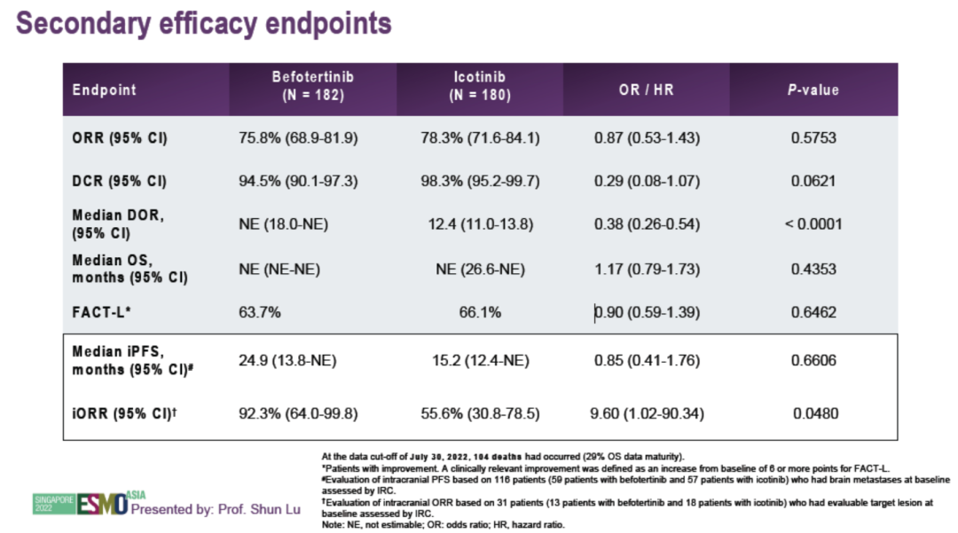 贝福替尼是一款三代口服TKI类药物,在一项II期临床研究中,针对携带继发性T790M突变的患者,该药已经展示了良好的抗肿瘤活性。其独立评审委员会评估的ORR和中位PFS分别达到67.6%和16.6个月,因此,其一线治疗的疗效数据备受期待。近期,该药一线治疗完整数据在ESMO-Asia公布,带来新的惊喜。