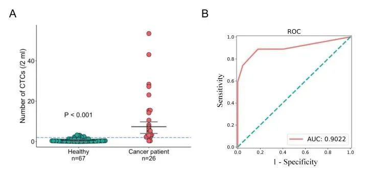 MBC患者(26例)与健康对照组(67例)在2 ml外周血中范围内检测到的CTC计数差异有统计学意义(median:5 vs 0,P<0.001),曲线下面积AUC为0.9022。