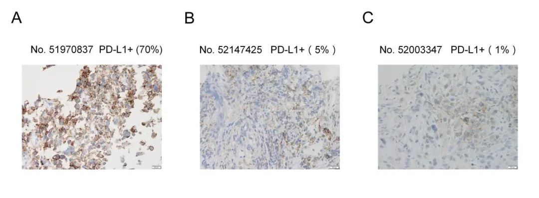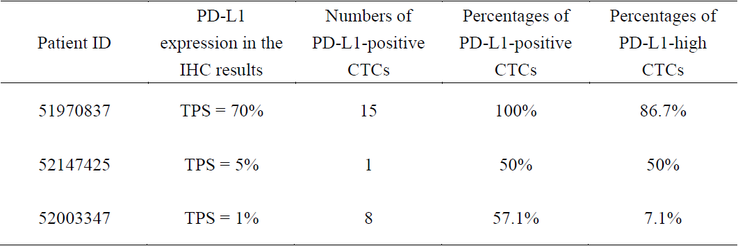 83.3%(20/26)患者为PD-L1阳性CTCs,包括PD-L1低表达CTCs(CTCPD-L1+)、PD-L-1中表达CTCs(CTCPD-L1++)和PD-L1高表达CTCs(CTCPD-L1+++)。26例患者中有17例(65.4%)至少有1例CTC PD-L1+++。在14例有组织活检的患者中也检测了PD-L1的表达。令人惊讶的是,14例患者中仅有3例(21.4%)检测到的IHC结果显示PD-L1阳性,且仅有1例患者显示PD-L1高表达。值得注意的是,所有3例患者均发现有PD-L1阳性CTCs。这些观察结果表明,与IHC结果相比,PD-L1在CTCs上的表达更频繁、更高。