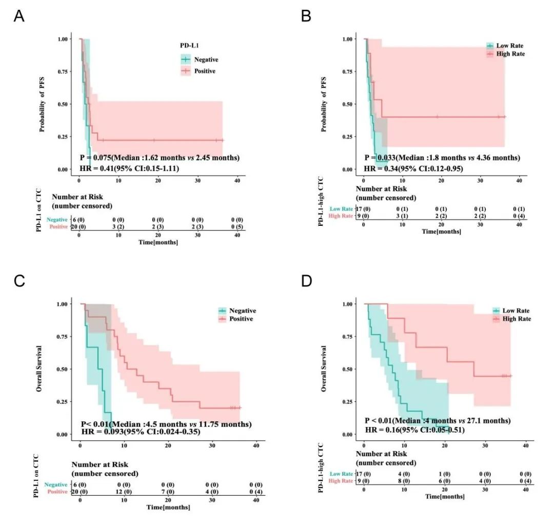 为了研究PD-L1表达对CTCs在预测抗PD-1免疫治疗的BC患者临床预后中的潜在价值,我们基于基线时PD-L1在CTCs上的表达评估了26例患者的PFS和OS。与PD-L1阴性的CTCs患者相比,PD-L1阳性的CTCs患者的PFS有明显但不显著的改善(P=0.075)。然而,与<35%的患者相比,CTCPD-L1+++比值≥35%的患者的PFS明显更长(P<0.05)。有PD-L1阳性的CTCs患者的OS明显长于无PD-L1阳性的CTCs的患者(P<0.01)。与<35%的患者相比,CTCPD-L1+++比值≥35%的患者的OS也明显更长(P<0.01)。综上所述,PD-L1的表达可以预测抗PD-1定向治疗患者的临床预后。