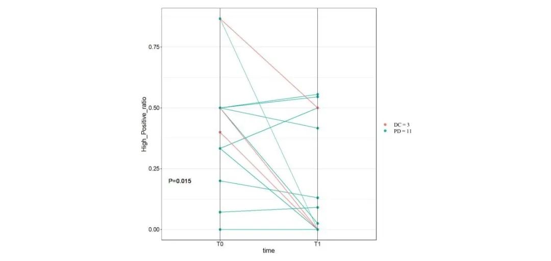 为了确定PD-L1的表达是否因免疫治疗而改变,我们检测了14例接受抗PD-1单药治疗的患者中PD-L1的表达,进行第二次抽血。在14例患者中,11例为PD,3例为疾病控制(DC)。进一步比较PD-L1在CTCs上的分布和临床疗效。与PD组相比,DC组的CTCPD-L1+++的比值显著降低(P<0.05)。结果显示,在抗PD-1治疗过程中,CTCs上PD-L1的表达是动态的,实时检测可能具有监测价值。