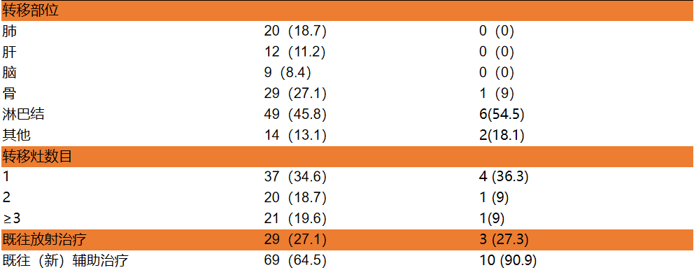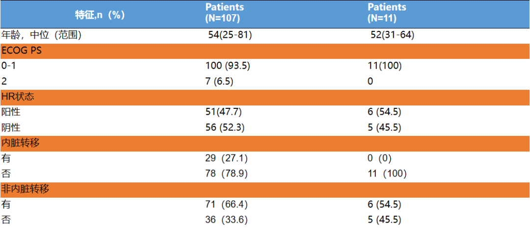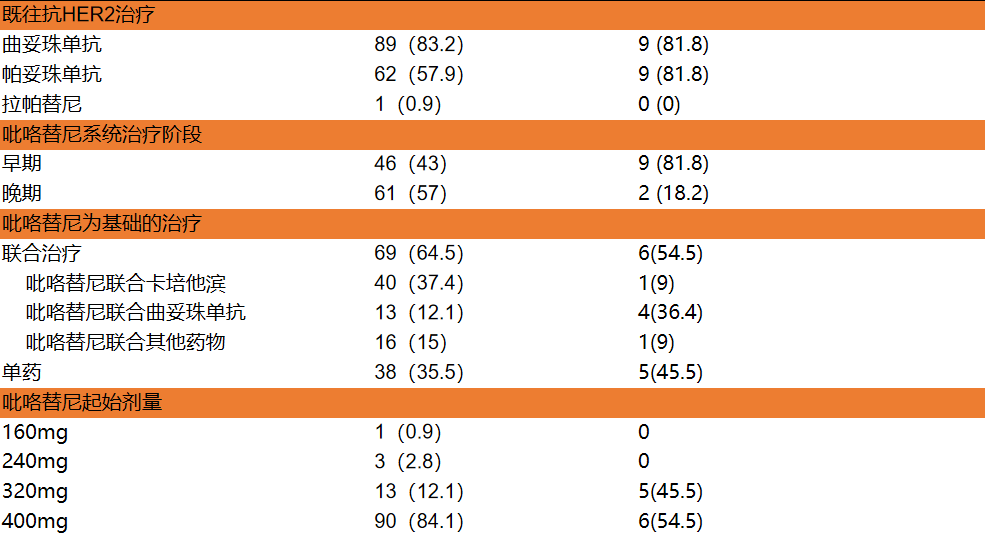 2020.8.31~2022.5.28期间,共有8家中心的124例患者入组该研究,最终共纳入107例符合条件的患者,入组患者的中位年龄为54岁(范围:25~81岁),大多数患者(93.5%)ECOG PS为0~1,且51例(47.7%)为激素受体阳性乳腺癌患者。46例(43.0%)患者在早期系统治疗阶段接受了吡咯替尼治疗,61例(57.0%)患者在晚期系统治疗阶段接受了吡咯替尼治疗。69例(64.5%)患者采用了含吡咯替尼的联合治疗方案(其中40例与卡培他滨联合治疗,13例与曲妥珠单抗联合治疗,16例与其他方案联合治疗),38例(35.5%)采用吡咯替尼单药治疗。