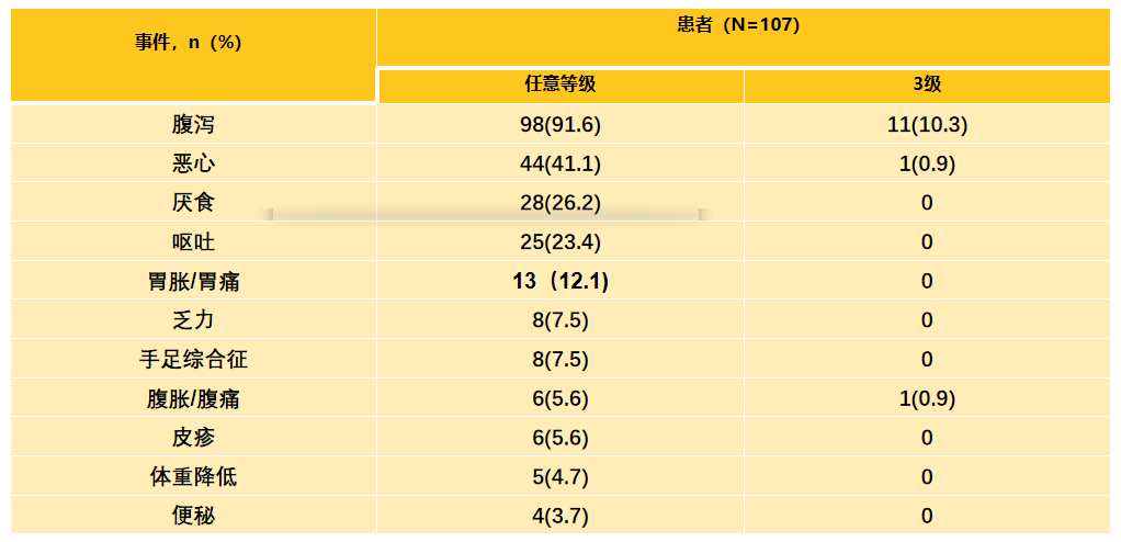 在该项研究中,最常见的任何等级不良事件为腹泻(91.6%)、恶心(41.1%)、厌食(26.2%)、呕吐(23.4%)和胃胀/胃痛(12.1%)。