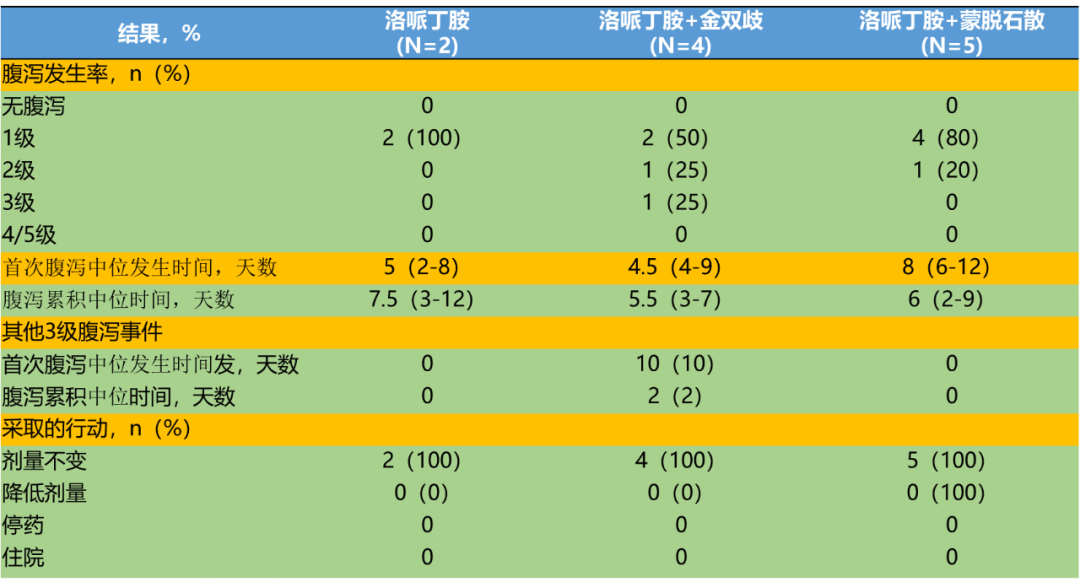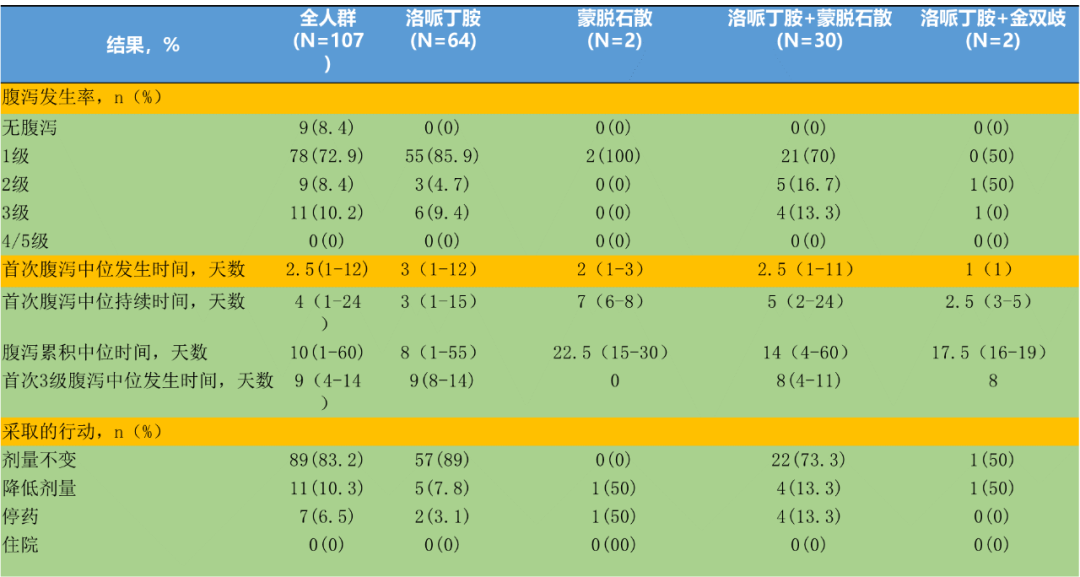 入组患者没有针对腹泻的管理策略或一级预防措施,研究人员按照常规临床实践对腹泻患者给予治疗,包括洛哌丁胺、蒙脱石散或金双歧(一种双歧杆菌、乳杆菌和嗜热链球菌的结合片剂)。其中,对于≥3级腹泻的患者,给予腹泻常规治疗并减量或停用吡咯替尼直至腹泻改善至1级及以下,腹泻改善后继续吡咯替尼治疗并给予腹泻二级预防治疗(如洛哌丁胺、洛哌丁胺+蒙脱石粉或洛哌丁胺+金双歧)。