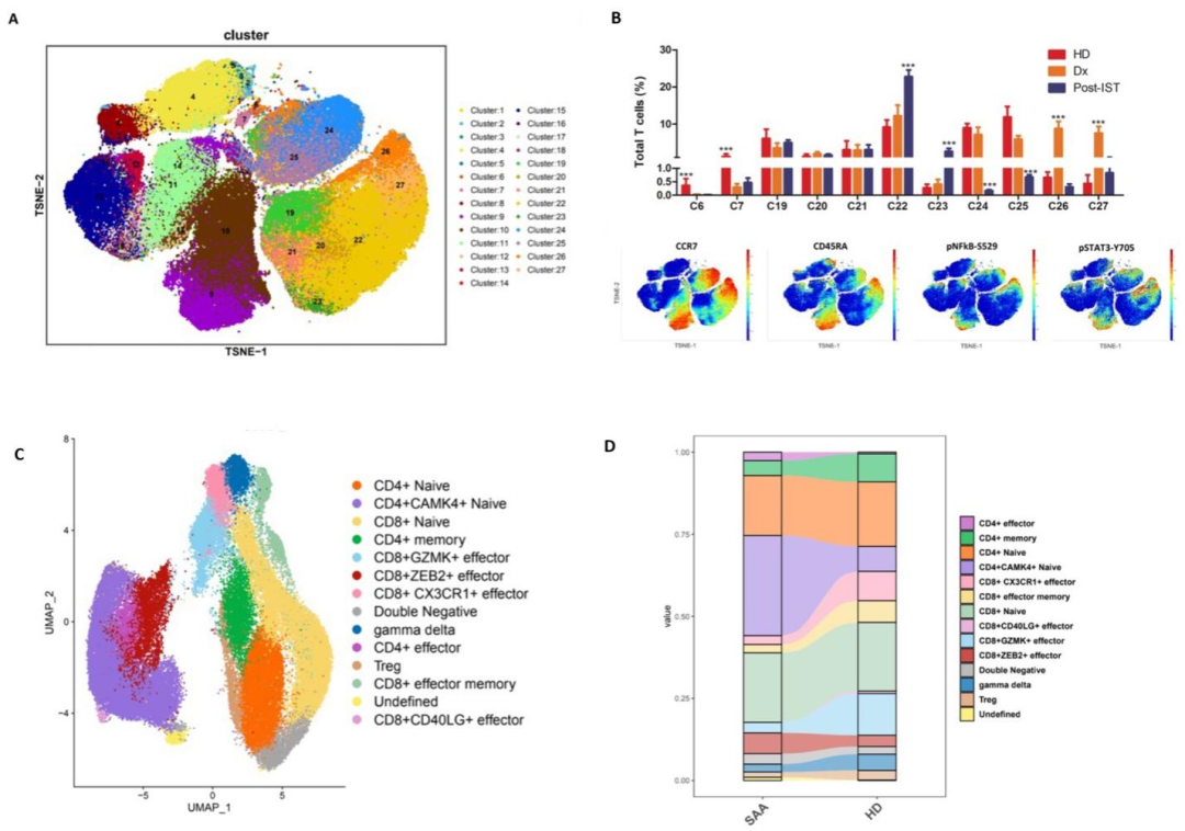 首先,本研究对9例初诊SAA(Dx-SAA),3例IST后SAA(postIST-SAA)以及4例正常儿童供者(healthy donor,HD)来源的骨髓单个核细胞(BMMCs)CyTOF进行分析,结果发现,与postIST-SAA和HD相比,儿童Dx-SAA呈现显著的细胞比例失衡,除造血干祖细胞数目急剧下降外,单核细胞及树突状细胞比例也显著下调。另外,免疫微环境中T细胞比例明显上调。根据蛋白表达特征分析,研究发现比例上调的这群T细胞表现为CD45RA和CCR7的高表达,且呈现磷酸化NFkB(pNFkBS529)及STAT3(pSTAT3Y705)显著激活,结合功能分析提示,该显著激活的细胞亚群极有可能为naïve T细胞(如下图A-B)。