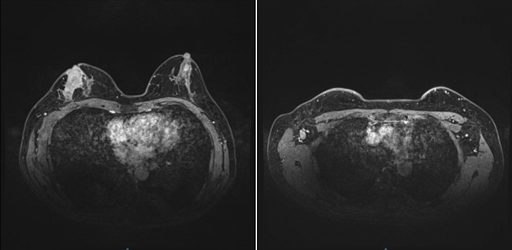 2022-4-19,乳腺MR:右乳外上象限腺体内(约9-12点钟方向,前中带区)条片影,大小约2.5×0.7cm,较前明显缩小、强化减低。右侧腋窝数个小淋巴结,较大者短径约0.5cm,较前缩小。
