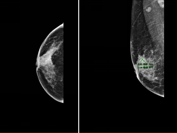 2021-11-30,钼靶:右乳外上象限较高密度肿块影,有浅分叶,约1.4×1.3cm大小,其内及邻近簇状分布细小多形钙化,符合乳腺癌诊断,BI-RADS 6类。右腋下见增大淋巴结影,约1.8cm直径大小。(图1)