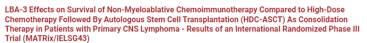编者按:第64届美国血液学年会(ASH)已经圆满落幕一个月之久,但Late-Breaking Abstracts(LBA)作为每年ASH大会的“重头戏”,绝对值得我们反复学习和深究。原发中枢神经系统淋巴瘤(PCNSL)仍是当前治疗上的难点之一,如何进行最有效的巩固治疗值得研究探讨,2022年ASH大会上,德国Gerald Illerhaus教授报告的一项研究(LBA-3)比较了非清髓性免疫化疗vs大剂量化疗+自体干细胞移植(HDC-ASCT)对于PCNSL患者疗效及生存的影响,引起了重点关注。为了更深入掌握该研究的相关内容,《肿瘤瞭望》特翻译整理该研究并邀请苏州大学附属第二医院血液科黄海雯教授进行点评解读。