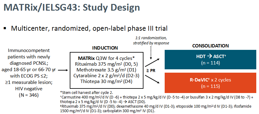 对于适合强化治疗的原发中枢神经系统淋巴(PCNSL)患者而言,常规应用“以高剂量甲氨蝶呤(HD-MTX)为基础”的免疫化疗进行诱导治疗,然后接续高剂量化疗+自体干细胞移植(HDC-ASCT)作为巩固治疗。然而,目前仍不明确常规剂量的非清髓性免疫化疗能否克服耐药并消除微小残留病灶(MRD),因此,我们开展了这项国际随机III期研究(MATRix/IELSG43研究),以新诊断PCNSL患者作为研究对象,首次比较了非清髓性巩固治疗vsHDC-ASCT方案作为巩固治疗的优劣性。