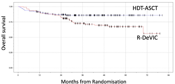 中位随访44个月,结果显示:①共有69%(239/346)的患者在诱导治疗后出现缓解,其中完全缓解率(CR)为27%,部分缓解率(PR)则为52%,两组巩固治疗均耐受性良好,分别有100(87%)和111(97%)例患者完成R-DeVIC和HDC-ASCT治疗。②在生存方面,大剂量化疗+自体干细胞移植组(HDC-ASCT)要明显优于R-DeVIC方案组,3年PFS分别为79%vs53%(HR=0.42;P=0.0003),3年OS则分别为86%vs71%(HR=0.47;P=0.01)。③安全性方面,6例患者巩固治疗期间死于毒性(A组2例,B组4例),6例患者死于非相关原因(A组5例,B组1例),二组的神经认知功能无差异。另外,有13例(3.8%)患者在诱导治疗期间死于治疗相关并发症,其中11例死于中性粒细胞减少性感染。