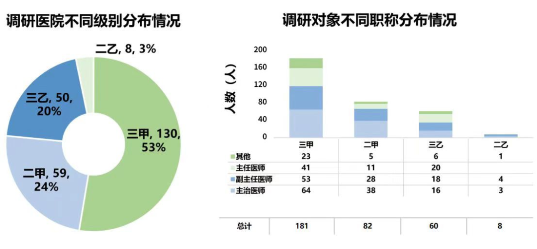 本次调研采用统一格式的线上调研问卷,向关注《肿瘤瞭望》公众号的用户(约14.8万)及相关的读者群发送线上调研问卷。共收回331份问卷,覆盖全国29个省份(省/自治区/直辖市/特别行政区)的247家医院,其中三甲医院130家(53%),三乙医院50家(20%),二甲医院59家(24%),二乙医院8家(3%)。受访者的职称分布见图1。
