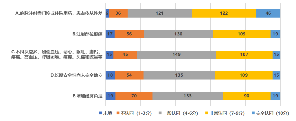 受访者认为铁剂临床应用不足的前三位原因分别为:“静脉注射需门诊或住院用药”,“注射部位疼痛”、“不良反应多”;三甲医院的第二顺位原因则是“长期安全性尚未完全确立”;其他级别医院的观点分布与整体人群一致。