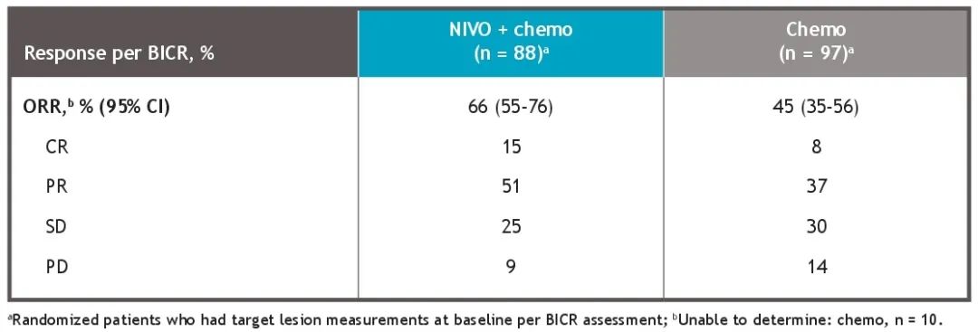 在PD-L1 CPS≥5且基线有可测量病变的患者中,NIVO+化疗vs.化疗的客观缓解率(ORR)为68%vs.48%;在所有随机入组患者中,ORR分别为66%和45%(表1,表2)。