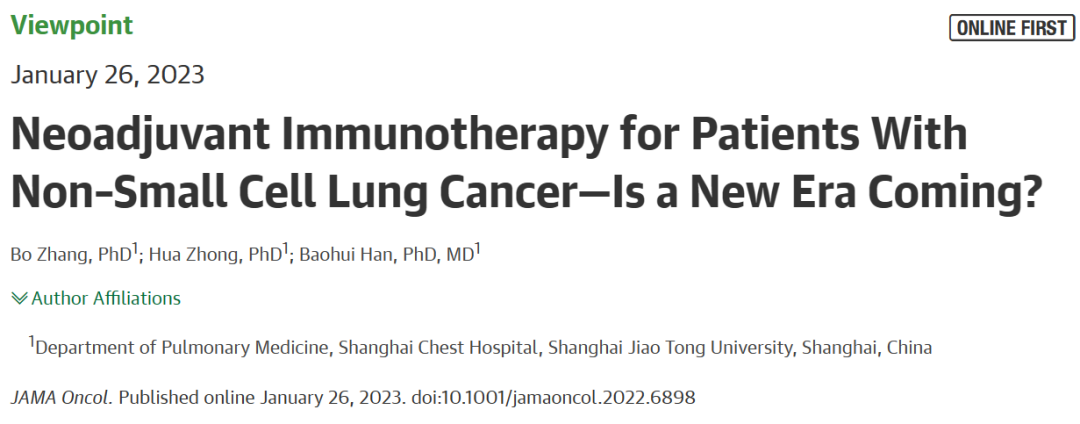 北京时间1月26日,国际知名临床肿瘤学期刊JAMA Oncology在线发表了来自上海市胸科医院韩宝惠教授、钟华教授团队的文章,该文章详细讨论肺癌新辅助免疫治疗的应用及未来发展,《肿瘤瞭望》有幸采访两位教授,将文章内容与同行进行分享。
