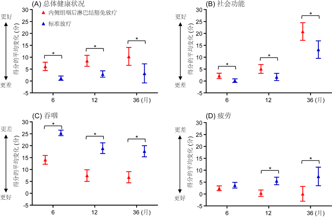 在毒副反应和生活质量方面,内侧组咽后淋巴结区豁免放疗组放疗相关毒副反应发生率更低,包括急性黏膜炎(内侧组咽后淋巴结豁免放疗组67.7%对标准放疗组79.8%)、急性吞咽困难(25.5%对35.1%)、体重下降(46.8%对57.8%)以及晚期吞咽困难(24.0%对34.3%)。另外,内侧组咽后淋巴结区豁免放疗组在健康状况、社会功能、是否容易疲劳及吞咽困难等方面的生活质量均明显优于标准放疗组。