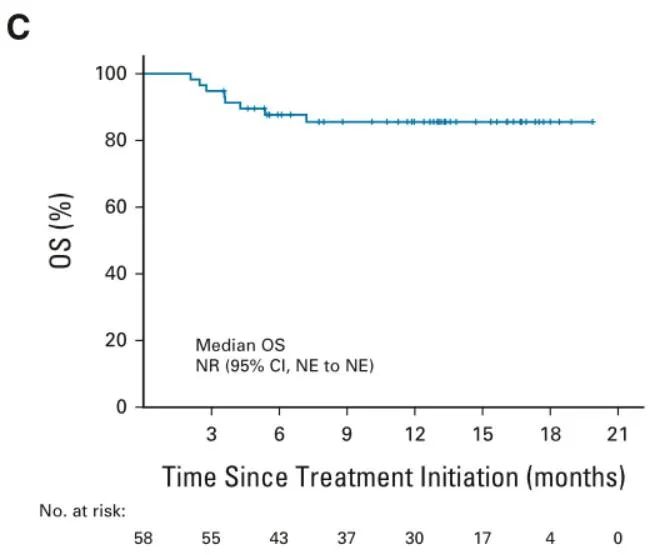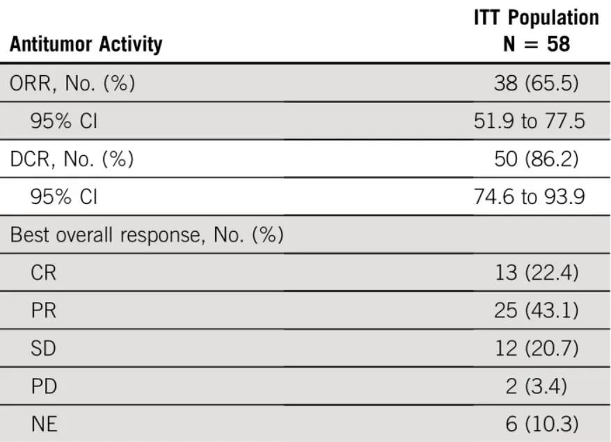 中位随访12.4个月,在52例可评估患者中,确认的总缓解率为65.5%(38例),其中13例达到完全缓解(CR率,22.4%),25例达到部分缓解(PR率,43.1%)[1]