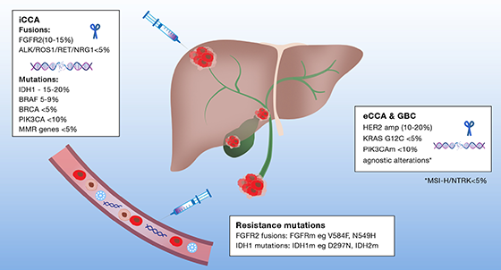 鉴于高达50%的胆道恶性肿瘤(BTCs)患者具有可操作的体细胞突变,肿瘤或液体活检应常规用于BTCs。三种FGFR2抑制剂和一种IDH1抑制剂已获得美国食品药品管理局批准用于BTCs的治疗。BTCs靶向治疗耐药极其常见,为取得BTCs治疗的更大进展,需要更有效的药物以及组合或序贯治疗策略。了解与不同分子谱相关的肿瘤微环境可能有助于开发新的免疫治疗策略。