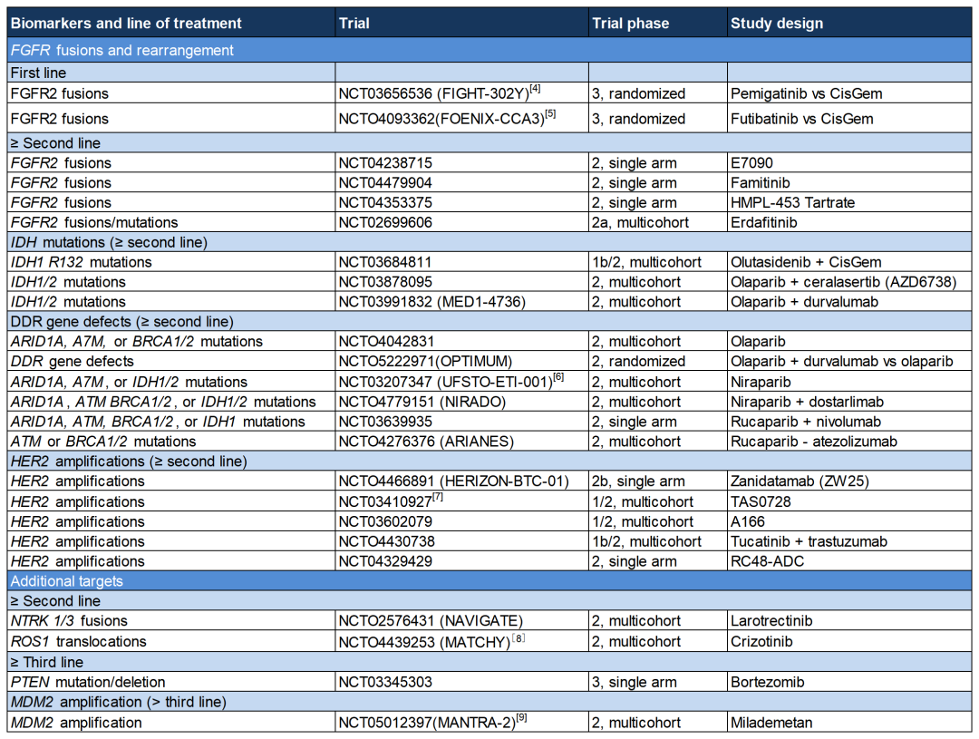 表1.正在进行的生物标志物驱动的BTCⅡ期和Ⅲ期临床试验