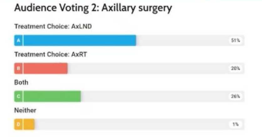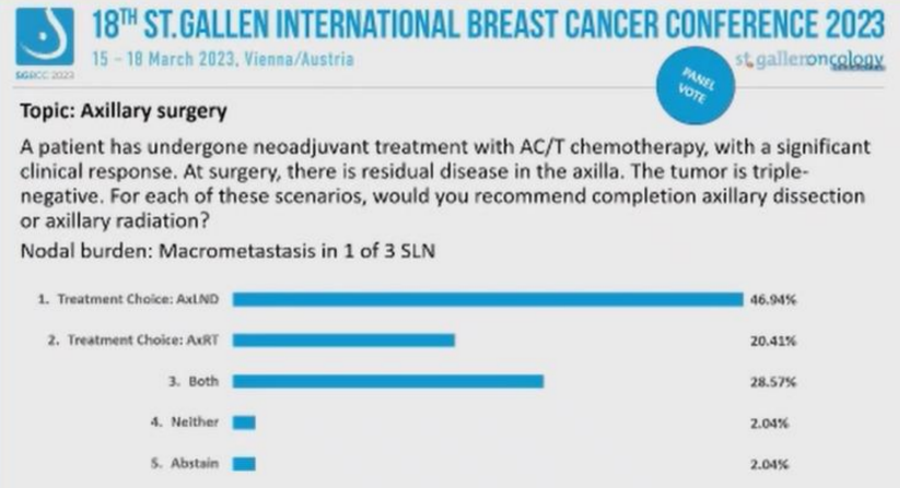 (1)三阴性乳腺癌患者接受AC/T新辅助化疗,临床疗效显著。在手术中发现,有残留的腋窝淋巴结(SLN 1/3宏转移)。对于这些情况,你会推荐腋窝清扫还是腋窝放疗?