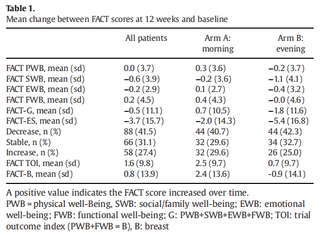 研究结果:2021年6月至2022年3月,共纳入245例符合条件的患者,随机分为早晨给药组122例(122/245,49.8%)和晚上给药组123例(123/245,50.2%)。患者平均年龄为61岁[标准差(sd)11.9],181例(73.9%)为绝经后患者,188例(76.7%)接受他莫昔芬治疗。A组122例患者中108例完成了基线和第12周FACT调查问卷,并获得了FACT-ES评分;B组123例患者中104例完成了基线和第12周FACT调查问卷,并获得了FACT-ES评分。12周时,A组和B组相对于基线的平均变化分别为-2.0(sd=14.3)和-5.4(sd=16.8)(Wilcoxon两样本秩和检验P值=0.22)。两组FACT-ES评分出现有临床意义降低(Fisher精确检验P值=0.89)或升高(P值=0.54)的患者比例无统计学差异。同样,从基线至第4周或第8周,未观察到FACT-ES评分有统计学显著变化。