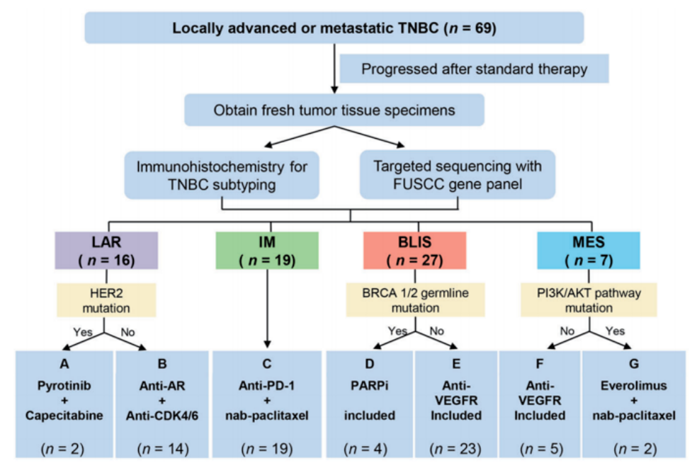 TNBC是一类异质性较强的肿瘤,也被称为“垃圾桶”;由于缺乏治疗靶点,患者的预后较差、死亡率较高,也被认为是最致命的乳腺癌。邵志敏教授团队绘制了全球最大的TNBC基因图谱,并提出了“复旦分型”:免疫调节型(IM)、腔面雄激素受体型(LAR)、基底样免疫抑制型(BLIS)、间质型(MES)[5]。在“复旦分型”中,根据免疫组化和基因检测结果精准选择靶向或免疫治疗,开展了FUTURE“伞式”研究,结果显示总体人群的ORR为29%,其中A组(LAR且存在HER2突变)患者的ORR达到了100%。