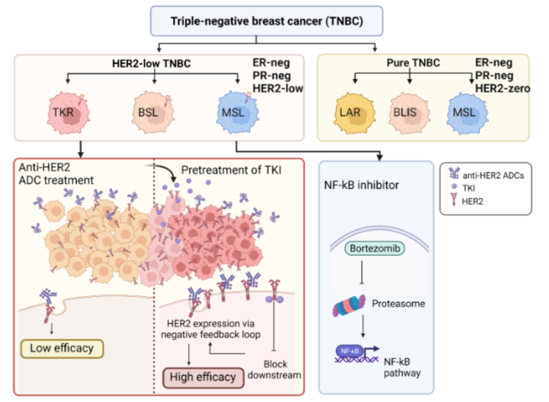 随着T-DXd相关研究取得的突破,HER2低表达乳腺癌越来越受到关注。邵志敏教授团队在“复旦分型”的基础上,进一步揭示了HER2低表达TNBC的组学特征,确定了三个亚组:基底细胞型(BSL)、受体酪氨酸激酶相关(TKR)和间充质干细胞型(MSL)[6]。其中,TKR亚组存在HER2激活和下游MAPK信号转导,对ADC抗HER2治疗具有一定的疗效,但经过TKI预处理可抑制HER2信号转导、反馈环诱导无功能HER2的累积表达,从而增加ADC的抗HER2治疗敏感性。此外,BSL亚组可能对mTOR抑制剂和mTORC1通路抑制有效;MSL亚组对Bortezomib和CSCs通路抑制有效。
