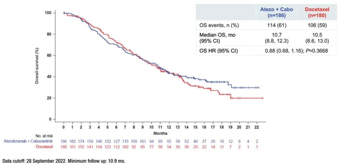 最终OS分析结果显示,在经抗PD-L1抑制剂和化疗治疗进展的晚期NSCLC患者中,阿替利珠单抗+卡博替尼组(10.7个月)vs多西他赛组(10.5个月)的中位OS无统计学显著差异(分层风险比<hr/>=0.88;95%可信区间[CI]:0.68-1.16;p=0.3668)。