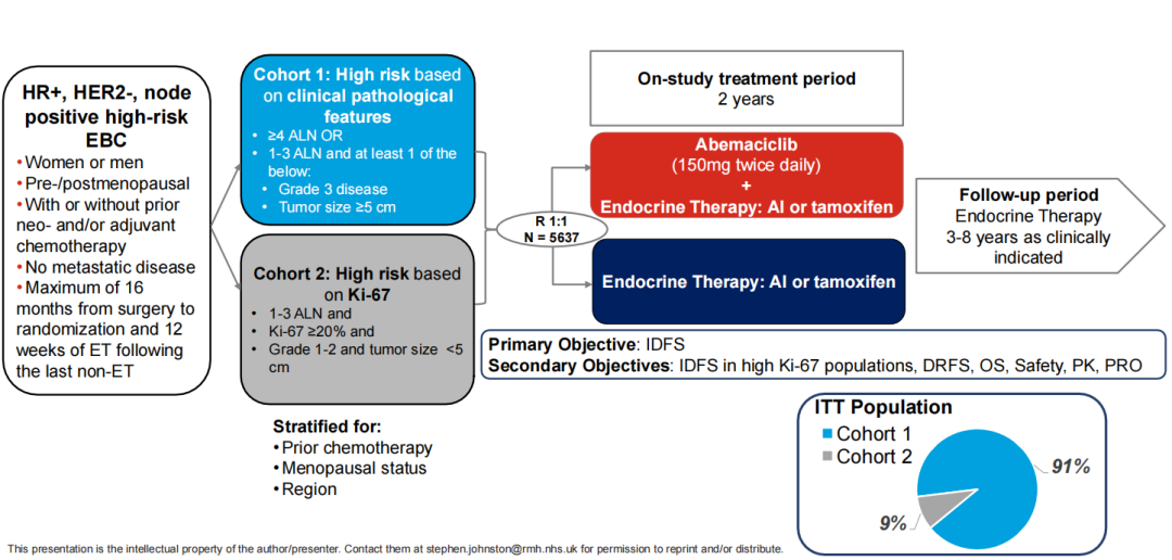 研究方法:患者被随机(1∶1)接受5~10年的ET±2年的阿贝西利辅助治疗。高危EBC为≥4个阳性腋窝淋巴结(ALN),或1~3个ALN且G3和/或肿瘤≥5 cm(队列1);另一个队列在有组织样本的患者中集中评估增殖生物标志物Ki-67,包括1~3枚腋窝淋巴结阳性和中心实验室检测的Ki-67≥20%作为唯一的高危特征(队列2)。意向性治疗(ITT)人群包括队列1(5120例)和队列2(517例)。采用Cox比例风险模型计算风险比(HR)。