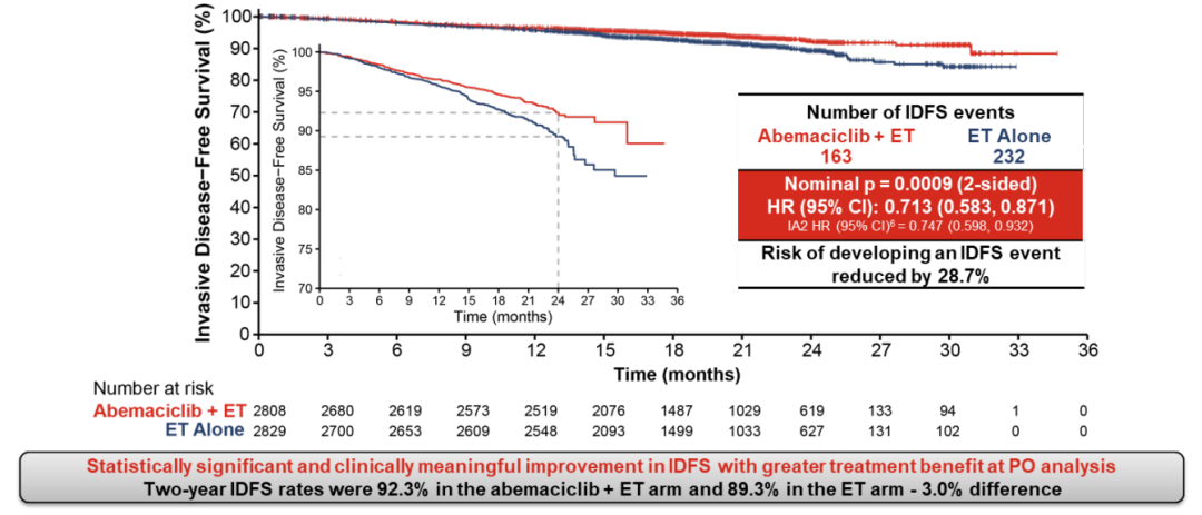 2020年SABCS大会上公布了monarchE研究中位随访19.1个月(Final iDFS)的分析结果。该研究达到预期主要终点,共有395例iDFS事件例数发生(预期为390例),具有统计学意义。ITT人群中,iDFS的主要结果分析显示,阿贝西利+ET治疗组与单纯ET治疗组相比,iDFS风险降低28.7%(HR=0.713,95%Cl:0.583~0.871),有统计学意义和临床意义的改善。2年iDFS率组间差异为3.0%(阿贝西利+ET组为92.3%,单纯ET组为89.3%)。