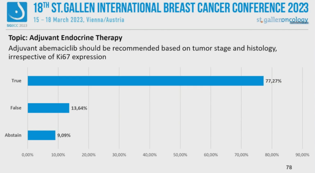 而时隔两年,在monarchE研究随访4年数据结果公布的SGBCC 2023大会上,各位专家再次对“阿贝西利辅助治疗的推荐应该基于肿瘤分期、组织学特征,而不考虑Ki-67表达水平”进行投票时,77.27%的专家则认为这一观点是正确的。近期举行的“南北汇”上,我们也针对这个话题进行投票,结果显示中国专家对考虑与不考虑Ki-67的意见基本持平。但需要注意的是,国内批准的阿贝西利辅助治疗适应症尚未国际同步,因此国内专家目前还是不能忽略Ki-67表达水平。