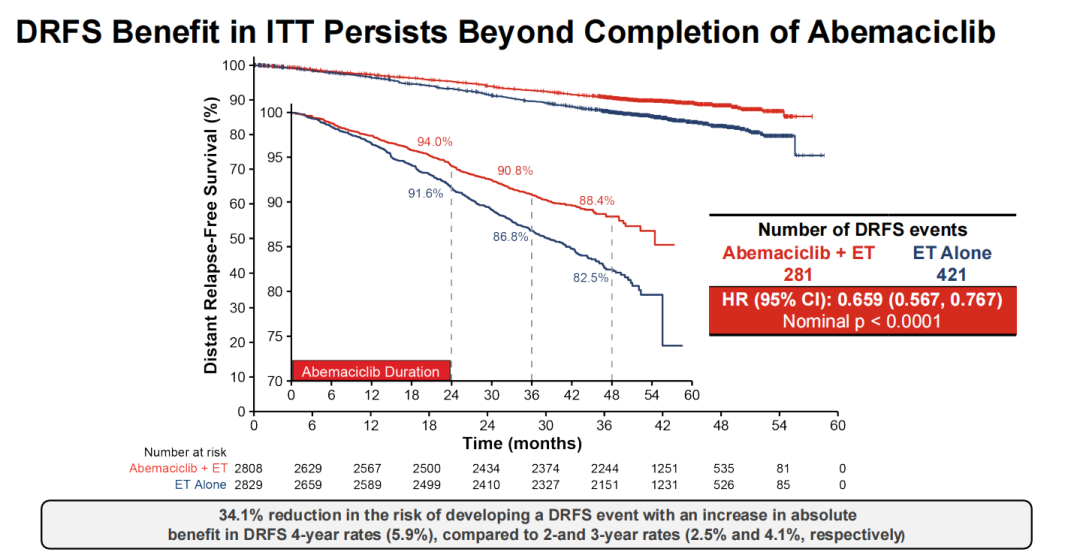 研究结果:中位随访42个月后,所有患者均停用阿贝西利。IDFS和DRFS的数据表明了治疗之后的持续获益。ITT治疗人群中,阿贝西利+ET可显著降低33.6%的IDFS事件风险。IDFS的HR值为0.664(95%CI:0.578~0.762),DRFS的HR值为0.659(95%CI:0.567~0.767)。4年IDFS率从79.4%改善至85.8%(绝对差值6.4%),DRFS率从82.5%改善至88.4%(绝对差值5.9%)。与2年和3年IDFS率相比(绝对差异分别为2.8%和4.8%),曲线的持续分离与4年IDFS率的绝对获益增加相关。