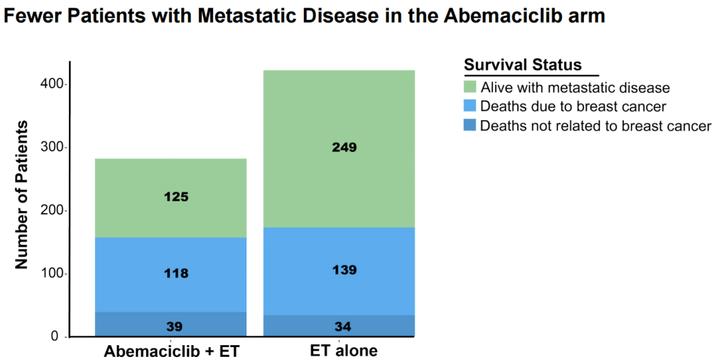 在乳腺癌复发的患者中,大多数总生存事件与转移性疾病导致的死亡相关。在这项期中分析中,monarchE研究患者的OS数据仍不成熟,ITT人群中有330例死亡(占总死亡率的5.9%),结合之前的分析,单纯ET组因转移性疾病死亡人数较多,这改变了两组之间的OS差异。此次期中分析,与单纯ET组相比,阿贝西利+ET组的死亡人数较少,但尚不显著;阿贝西利+ET组中存在远处转移性疾病的患者数量较少,并可能进一步影响后续随访的OS差异。