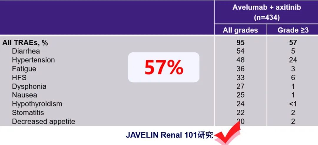 安全性:在现有的大型研究的安全性分析中,以阿昔替尼为基础的靶免联合方案表现出了较为良好且稳定的安全性,特别是在JAVELIN Renal 101研究中,≥3级的TRAE发生率为57%,低于其它研究。这是由于阿昔替尼对靶点的选择性较高,不易发生脱靶。此外,由于阿昔替尼的半衰期较短,不易在体内蓄积,因此在出现AE时也可以通过短暂停用阿昔替尼来快速发现AE来源,从而快速做出对症处理。因此在联合用药安全性方面,阿昔替尼有明显优势。