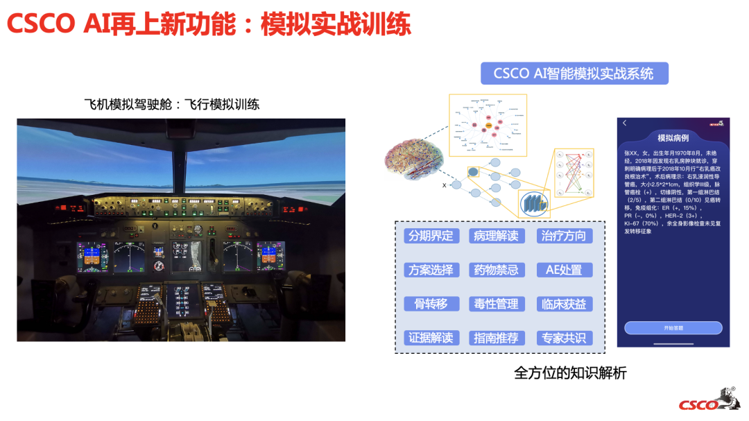 CSCO AI之于医生,就像GPS之于驾驶,能够助力临床医生提高诊疗的效率和规范性,降低治疗过程中的决策失误和不规范行为,可以极大程度降低不同层级的医生,不同区域医生知识和经验的差异。CSCO AI的模拟实战功能就如飞机模拟训练舱,飞行员需要通过模拟训练来提高实际飞行时的反应能力和决策能力,医生同样可以通过CSCO AI这一新功能,学习、巩固、强化规范化的诊疗知识。模拟实战模型中数万例智能病例,多维度解析形成在线模拟决策,逐层引导式智能出题,通过CSCO AI伴随式讲解及智能纠偏引导,帮助医生深度理解规范化决策逻辑形成决策习惯,增强决策信心,更好地应对复杂的诊疗挑战。便捷的学习、训练方式也能够提升学习效率,规范诊疗“模拟机”真正加速年轻医生的进步与成长。