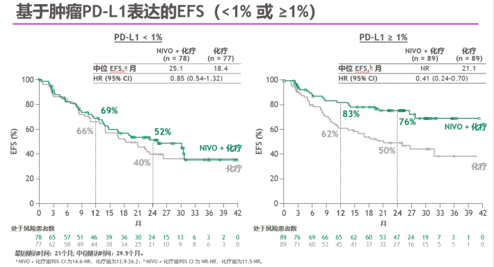 在PD-L1<1%患者中,免疫联合组和化疗组的中位EFS分别为21.5 vs 18.4个月(HR=0.85,95%CI:0.54-1.32);PD-L1≥1%患者的相应数据分别NR和21.1个月(HR=0.41,95%CI:0.24-0.70)。