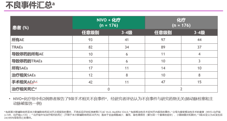 免疫联合组和化疗组各级不良反应发生率相似,两组3-4级治疗相关AE发生率分别为34%和37%;导致停药的所有级别治疗相关AE发生率皆为10%左右;手术相关的3-4级AE发生率相似,分别为11%和15%。治疗相关死亡率在免疫联合组为0%,化疗组为2%。
