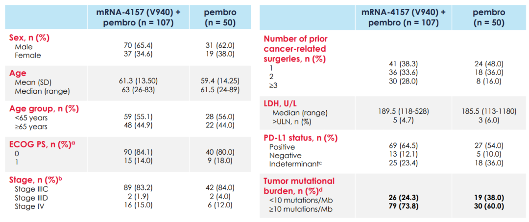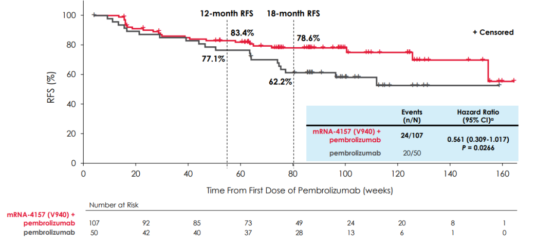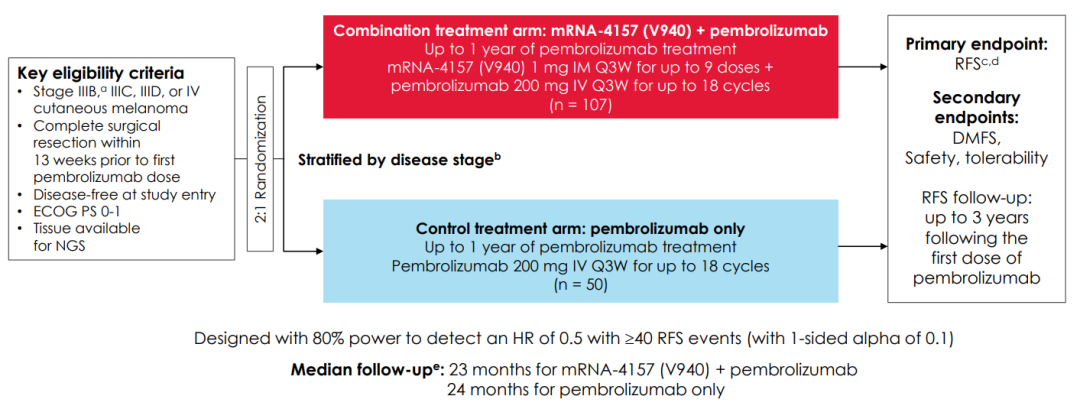 研究背景:KEYNOTE-942-054和CheckMate-238研究奠定了PD-1单抗辅助治疗在高危复发黑色素瘤患者中的地位。以帕博利珠单抗为例(与安慰剂对照),5年无复发生存率为55%和38%。mRNA-4157是一款个体化新抗原预测的治疗方法(疫苗疗法),通过收集患者组织和血样标本,进行NGS测序,通过系列算法筛选出最多34个新抗原并合成相应的mRNA,最后注射给患者以此来激活特异性T细胞免疫。该研究将mRNA疫苗联合PD-1单抗对比PD-1单抗用于高危患者辅助治疗。