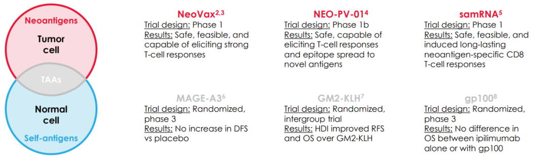 近年来,针对肿瘤新抗原的疫苗治疗,因能增强特异性T细胞功能而备受关注。新抗原是肿瘤细胞所特有的抗原,是由肿瘤细胞生长过程中的特异性突变发展而来,但并非所有突变都能够成为有效靶点。优质的靶点不仅要出现在肿瘤细胞表面,还需要能够激发患者足够强的免疫系统反应,但在实际情况中仅有少量的突变会被提呈到肿瘤细胞表面成为新抗原,因此新型的算法和mRNA制备平台是解决这一技术的关键。NEOVOX、NEO-PV-01和samRNA等3款同类产品目前均已在早期临床研究中。国内也有多家专注新抗原预测的mRNA疫苗正在研发和临床研究中。笔者所在中心也即将在年中启动相关研究。