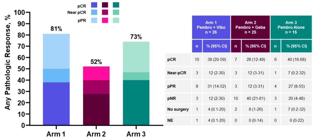 从下图看,溶瘤病毒组的病理学缓解率最低(52%),TIGIT联合组最高(83%)。
